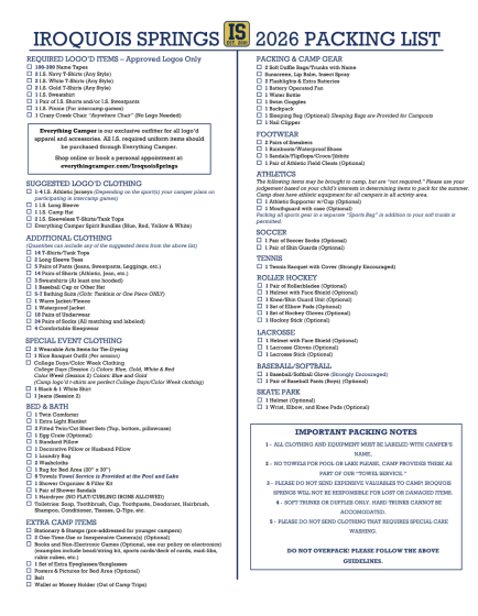 While we are not a uniform camp and campers can choose to wear what they like, we ask everyone to purchase some Iroquois Springs t­‐shirts, shorts and sweatshirts for the times we go on trips outside of camp, participate in inter­‐camp games and tournaments, and it makes for some great camp spirit.